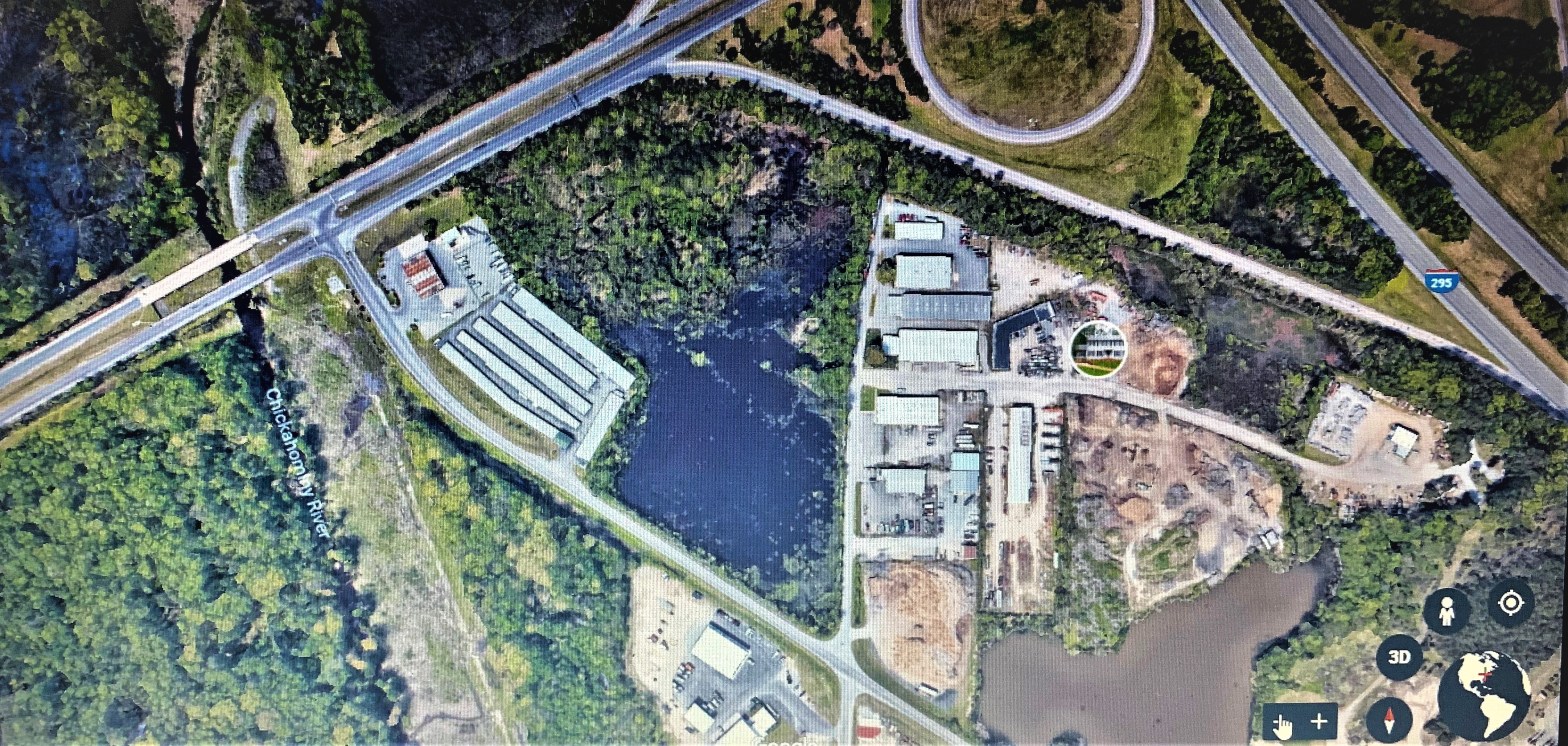 As you can see in the google earth picture, Chamberlayne Swamp is bordered on the west side by a major thoroughfare, a gas station and that set of rectangles is a storage facility. As you go east, you see the swamp itself and another road populated by a number of small businesses. Continue to the east and you see additional swamp. Beyond that is another industrial property. To the south more industrial zone businesses, then the Pahmunkey River, and beyond that a full neighborhood of houses. What you see to the north, is Interstate 295.