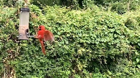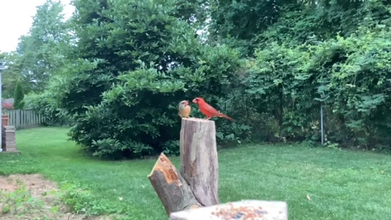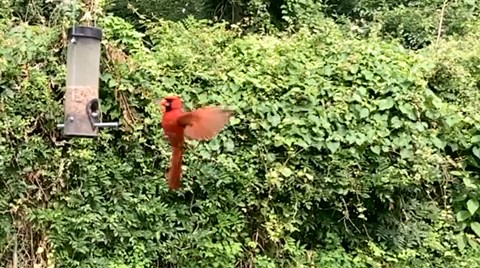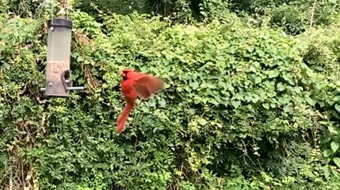 The Northern Cardinal is our most frequent visitor so I had a number of videos showing them fly into feed and once or twice the male would fly in to inspect my camera propped up on our patio table. Watching these birds in slow motion gave me a new look into their flying of two strong wing beats and then a rest, two beats and rest. I also recorded a male cardinal at my feeding station who was joined by a female, presumably his mate. Upon her arrival the male snatched up a beak full of seeds and placed them in her open mouth as a gift. After doing a bit of research I found that this behavior is not unusual and learned that cardinals are known to mate for life and have long been symbols of fidelity and romance. Who knew?