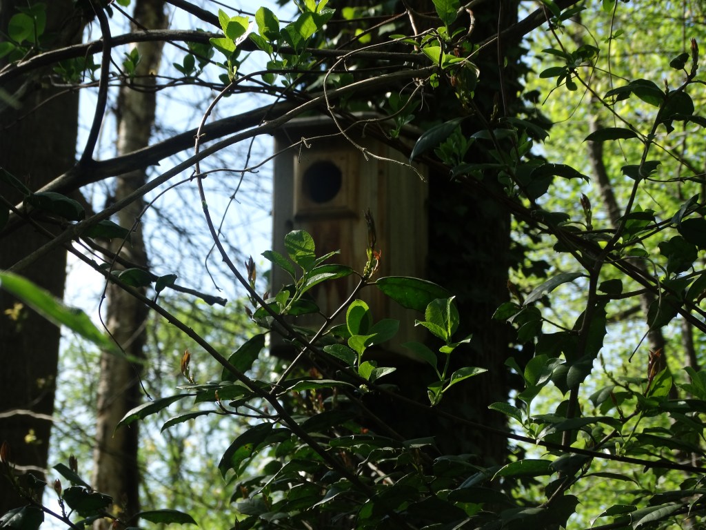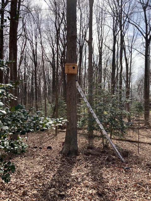 This year a friend of mine sent me a barred owl nest box. Since barred owls don’t get along with screech owls (or any bird for that matter) I decided to place the barred owl box far from my neighborhood on my sister’s property about a twenty minute drive. This nest box is even more luxurious complete with two rooms (to prevent predation of the owlets by other animals) front door awning and little ledges for a young owl to hold on to when leaving the nest. This box has also not had any visitors and it’s getting late in the season. Barred owls in Virginia should have found a nest and mated a couple of months ago so it seems that I will have to wait another year for the chance to attract owls to the nest.